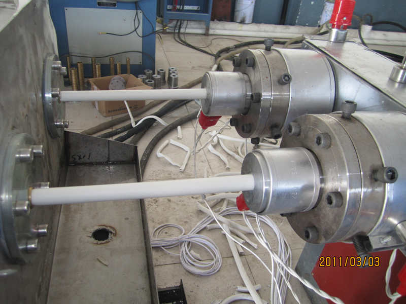 2. صب البثق , يدخل الخليط إلى بثق المخروطين المخروطيين ، حيث يتم تلوينه وذابه تحت دفع وتدفئة البراغي ، ثم تشكل في شكل أنبوبي من خلال قالب.